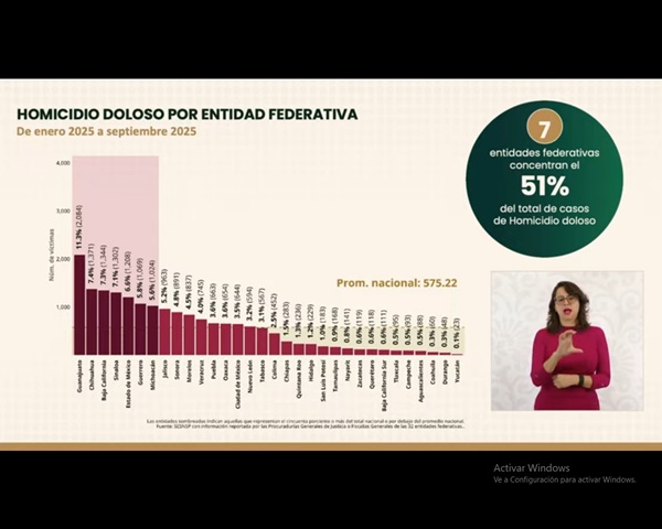 El acumulado de enero a septiembre de 2025 también refuerza la tendencia positiva para Zacatecas: el estado se ubica en el noveno lugar nacional con menor número de homicidios, con 11 víctimas en total, equivalente al 0.6% del total del país.